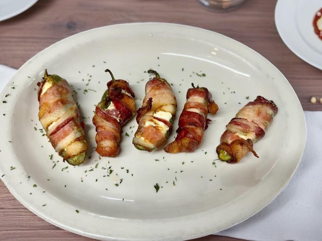 Fresh cored jalapenos, stuffed with cream cheese, and wrapped in crispy bacon. Served with house made Ranch dipping sauce