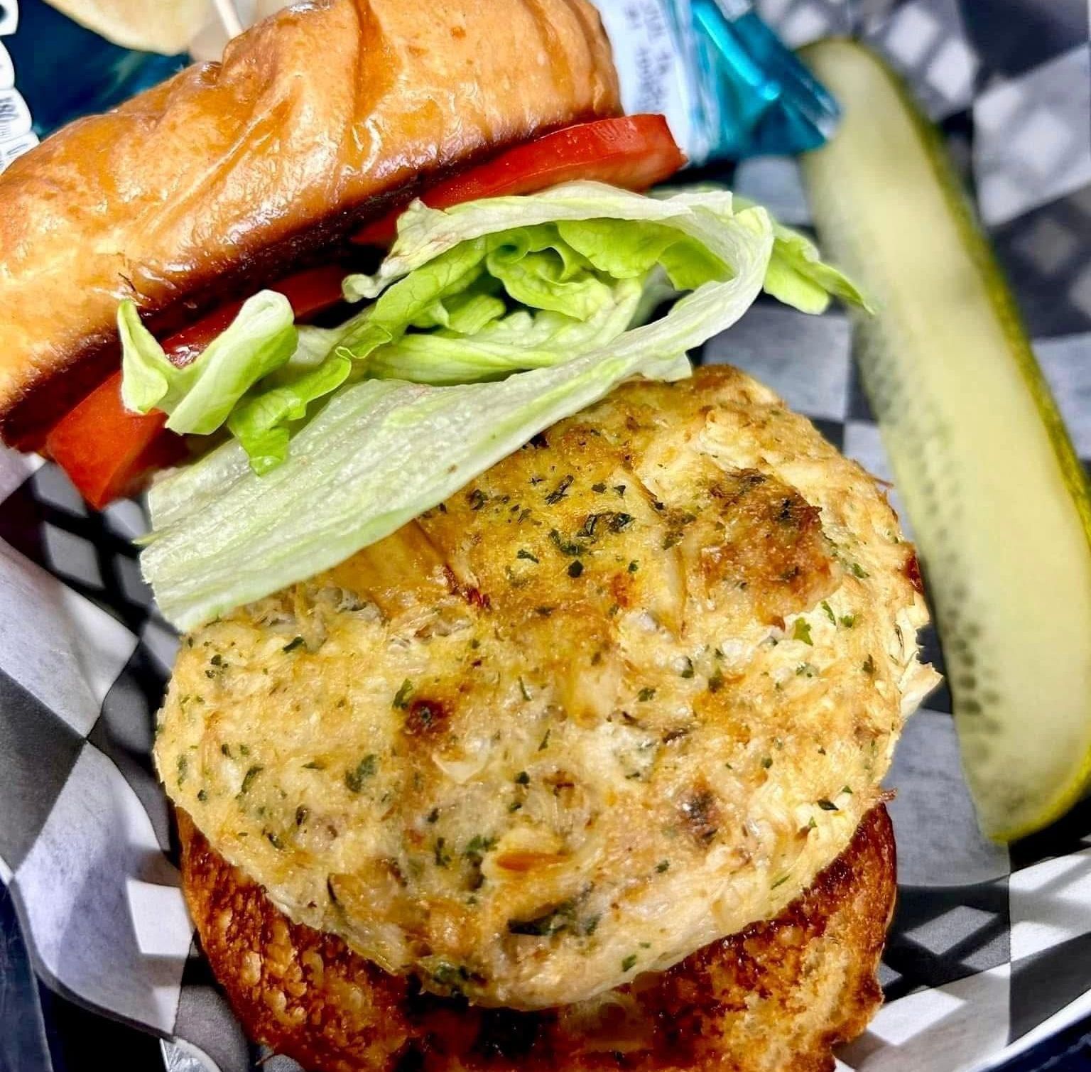 Our zero filler house recipe! Broiled and served on a brioche bun with lettuce, tomato, and your choice of cocktail or tartar sauce